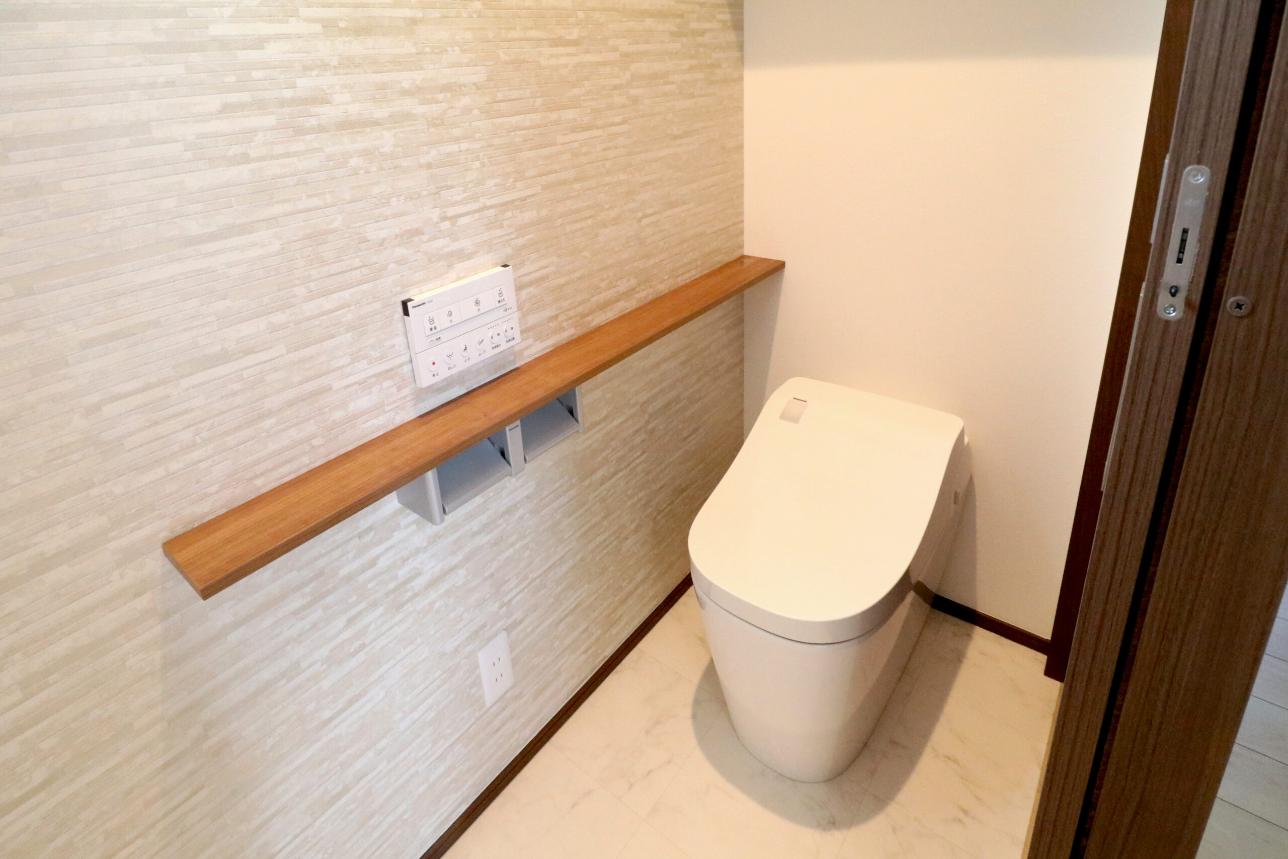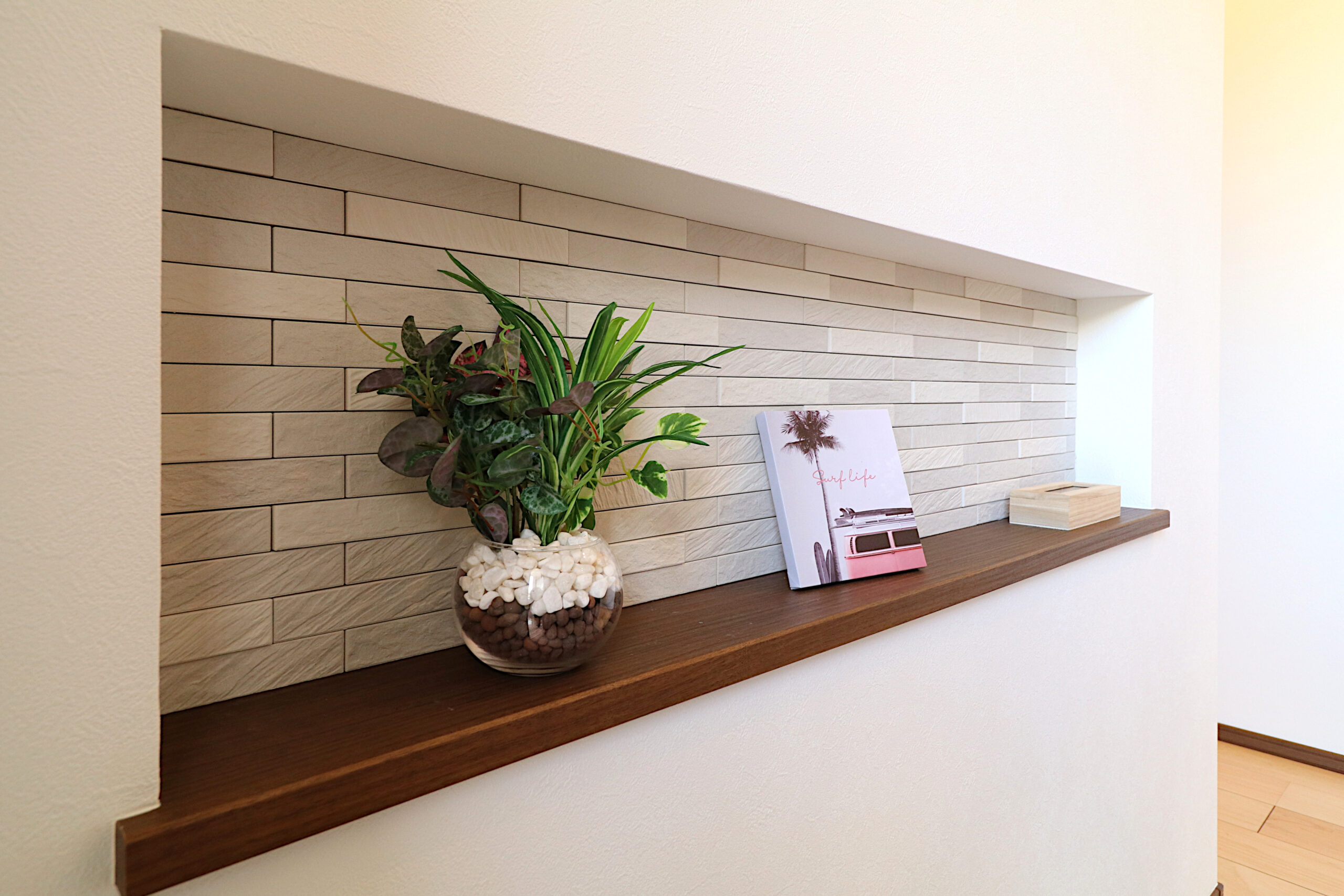 テレビ裏にはアクセントウォールを施工しており、空間の広がりを感じさせています。
